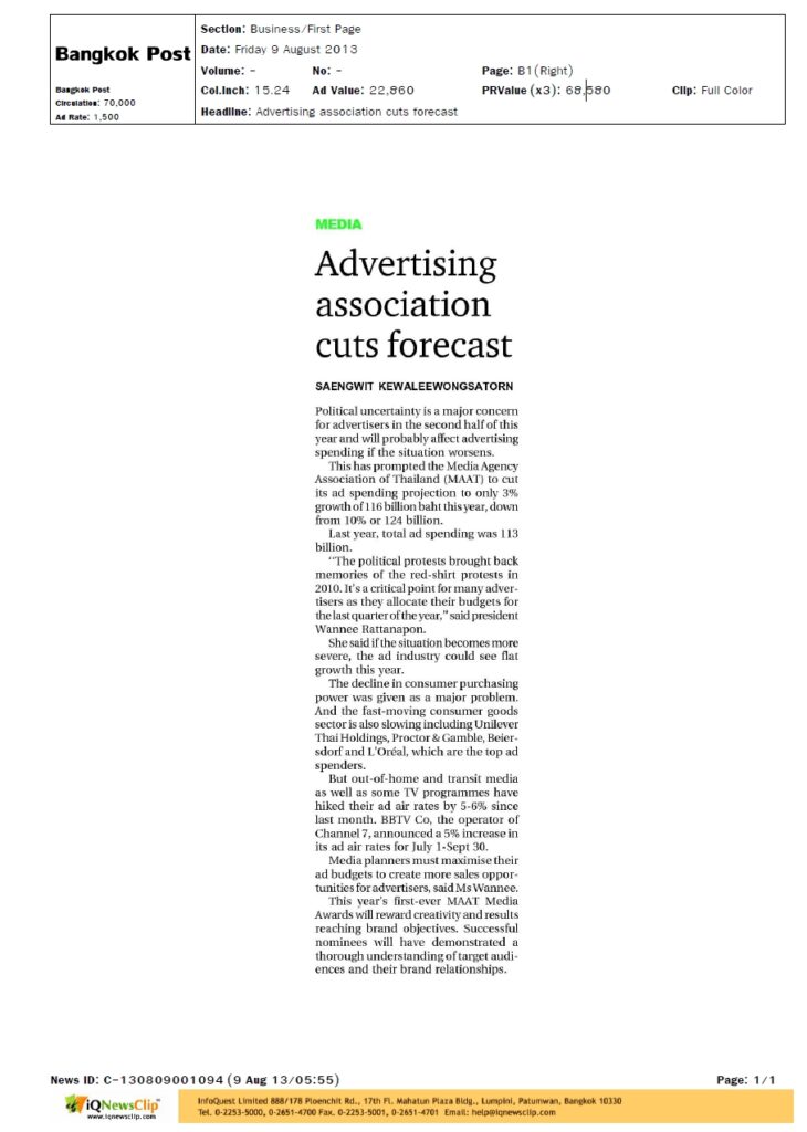 หนังสือพิมพ์ Bangkok Post หัวข้อข่าว: การคาดการณ์ปรับลดของสมาคมโฆษณา